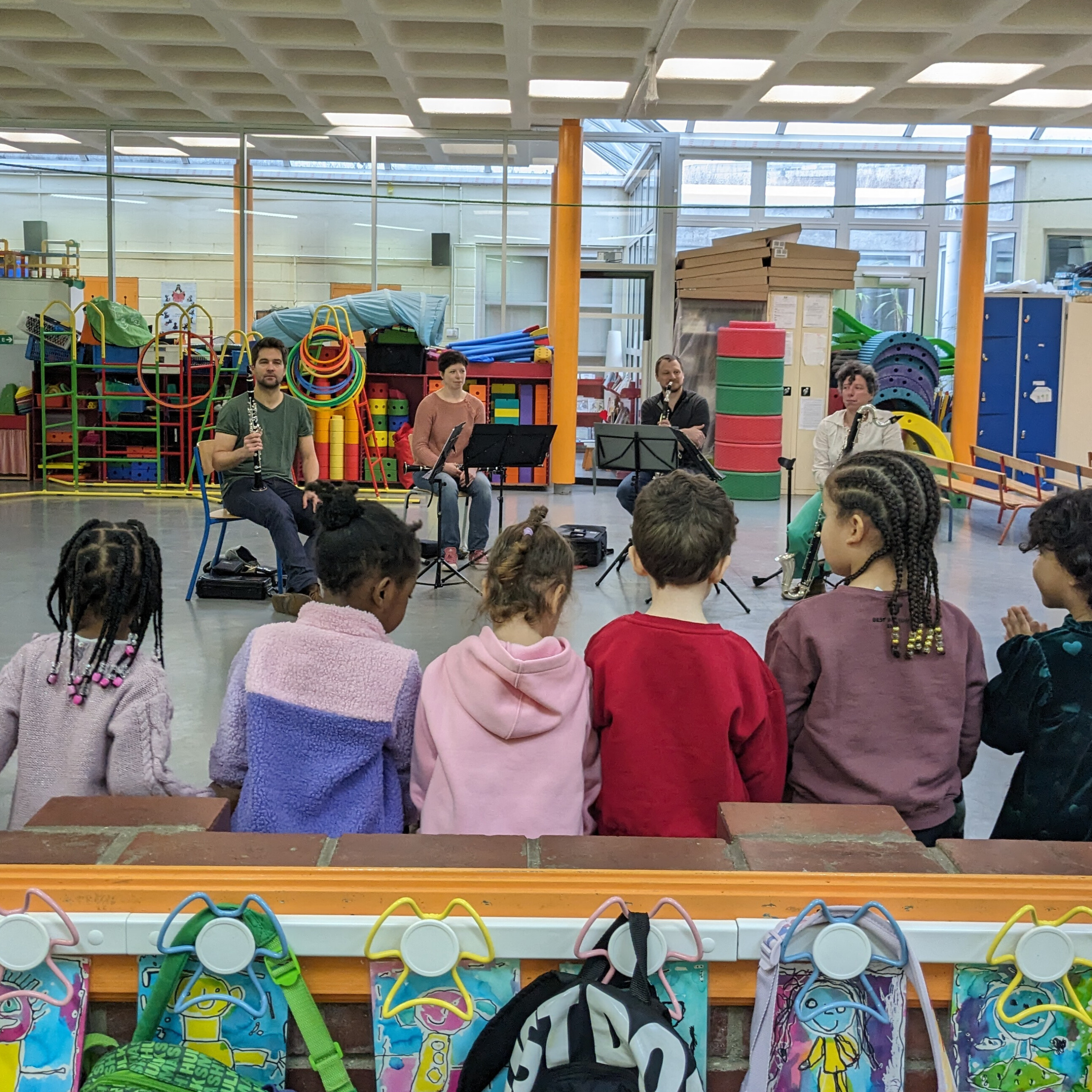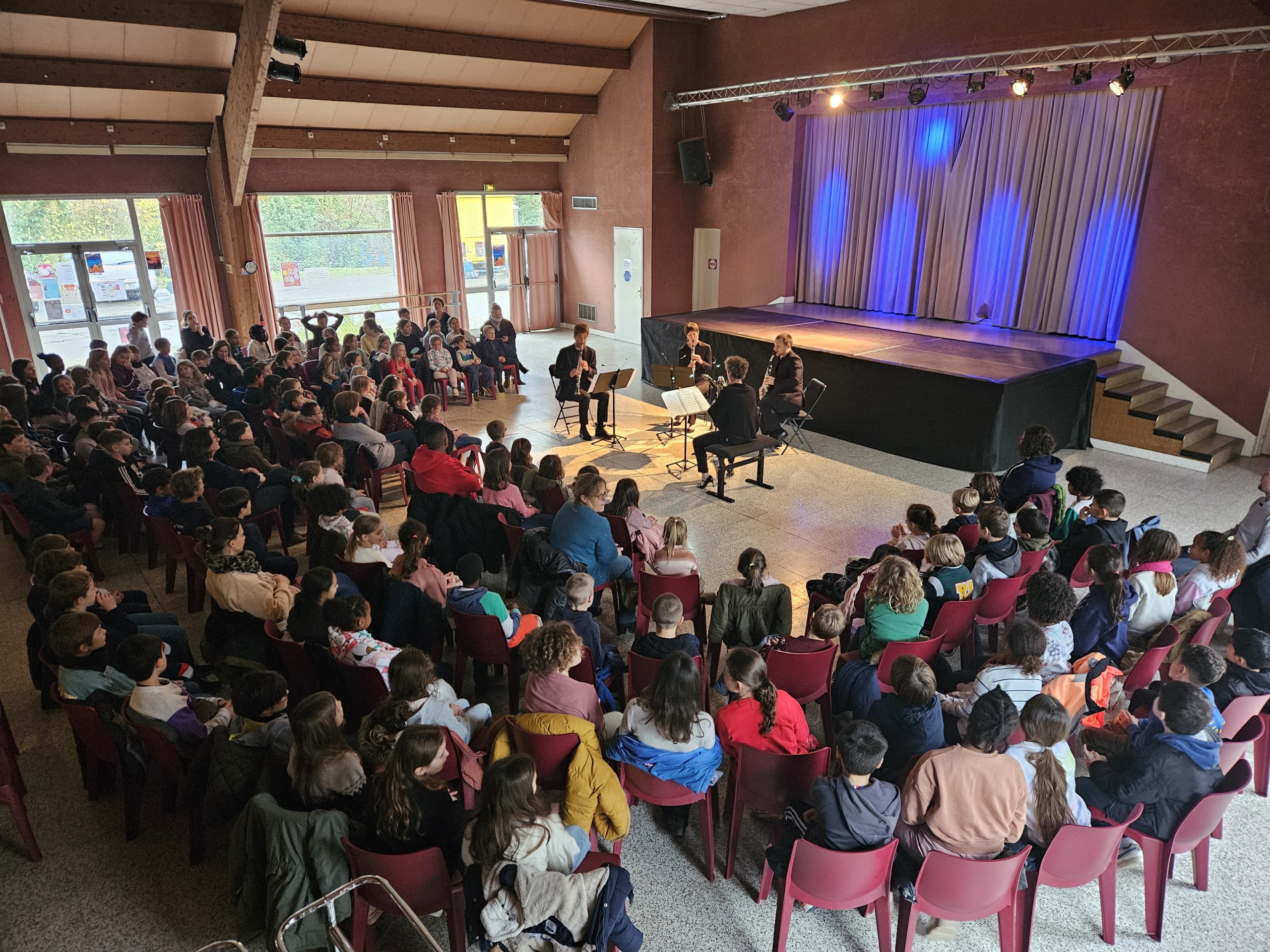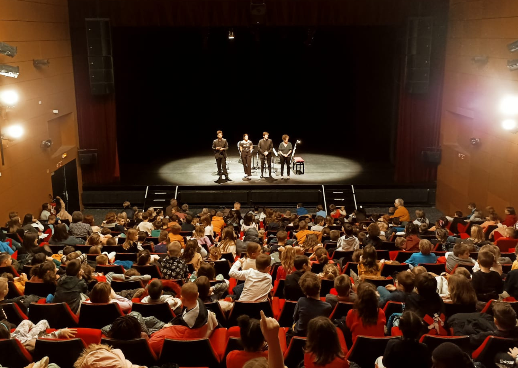 Un morceau rappelle la comédie musicale, un autre une danse, un marin dans la tempête, et un tas de sons insolites qu’on peut faire en soufflant dans ce tube en bois. Dès que l’ambiance est posée, ils commencent à donner les secrets de fabrication du quatuor et de la musique de chambre.